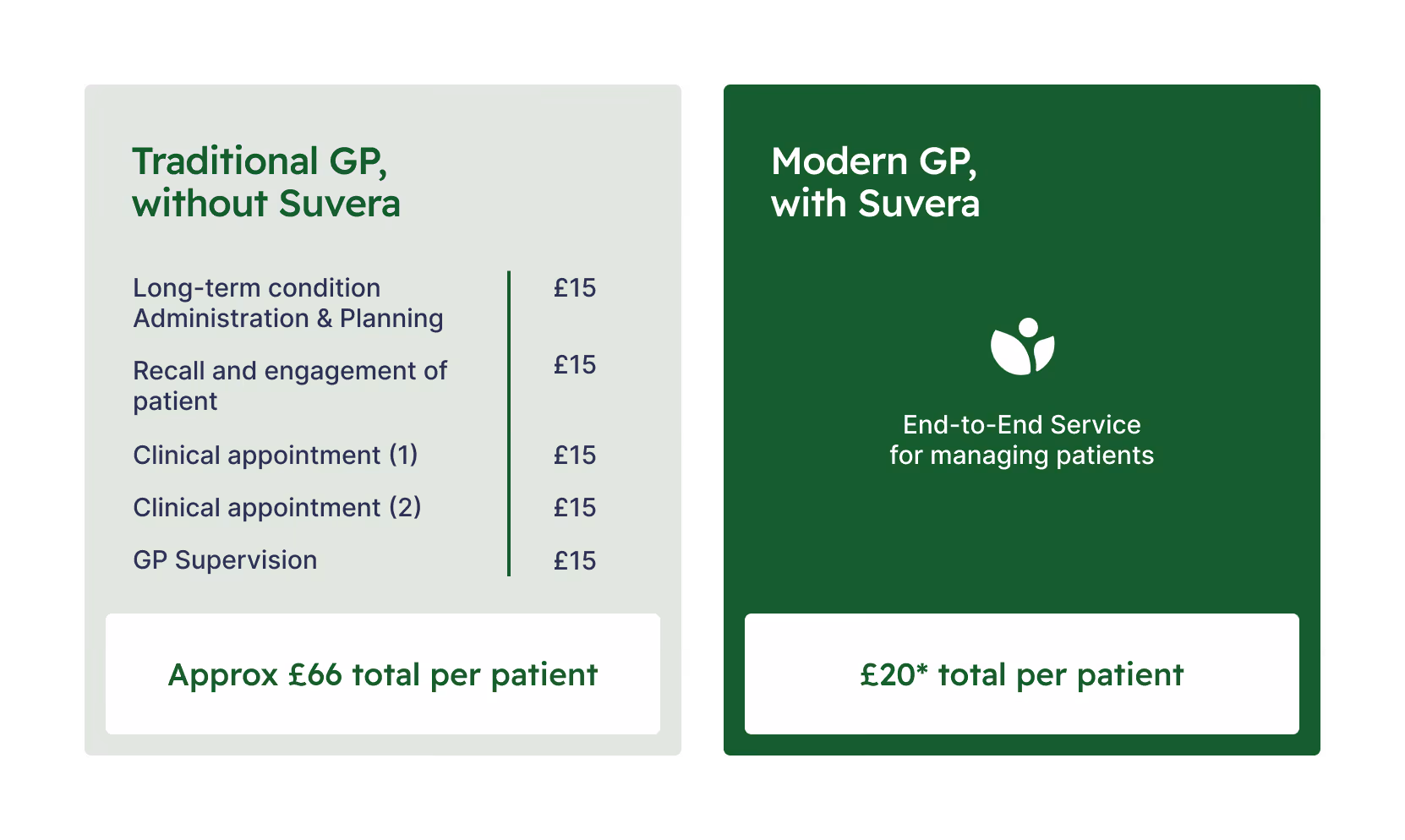 • Cost per patient: £66 traditional vs £20 with Suvera (£46 saving per patient)